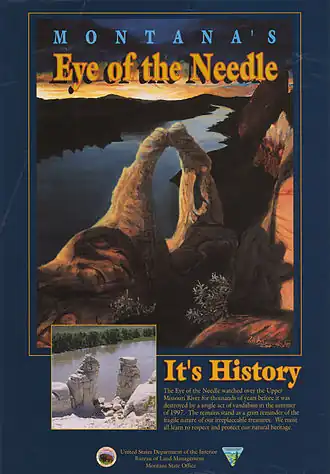 The Eye of the Needle was an 11 feet (3 m)-high naturally occurring geographic formation shaped much like an inverted "V".[1] It was located along a section of the Upper Missouri National Wild and Scenic River, on land administered by the Bureau of Land Management (BLM), approximately 56 miles (90 km) downstream from Fort Benton and adjacent to LaBarge Rock, another notable rock formation.[2] The arch was described by Meriwether Lewis in his journal during the 1805 Lewis and Clark Expedition up the Missouri River.[3]