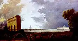 Enormous earthen stands for spectators were built on each side of the field, with a seating capacity estimated at 100,000.[3] The Seine was crossed by a bridge of boats leading to an altar where oaths were to be sworn. The new military school was used to harbour members of the National Assembly and their families. At one end of the field, a huge tent was the king's step, and at the other end, a triumphal arch was built. At the centre of the field was an altar for the mass.