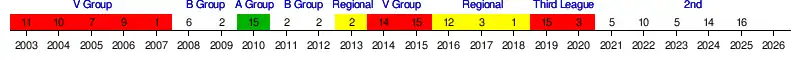 The following two seasons were successful for the club, as they managed to earn second place twice in a row, qualifying for the promotion playoffs, but Sportist were unlucky on both occasions, losing to Chernomorets Pomorie and Botev Plovdiv respectively. For the 2012–13 B Group season, Sportist Svoge did not obtain a license due to financial reasons and was excluded from the second league. The team was relegated to the fourth tier of Bulgarian football, but managed to promote to the third tier the following season, 2013–14. After 2 seasons in the third division, Sportist was again relegated to the fourth tier. The team remained there until 2018 when they won promotion to the third league once more for the 2018–19 season. Svoge finished in 15th place following its return to the third division.