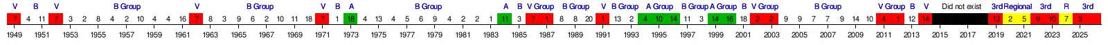 PFC Shumen have played in the A Professional Group for a total of seven seasons: 1972–1973, 1983–1984, 1993–1996 and 1998–2000.[4] The club reached the semifinals of the Bulgarian Cup on two occasions, in 1957 and 2006, when they narrowly lost 2:1 to Cherno More Varna after extra time.