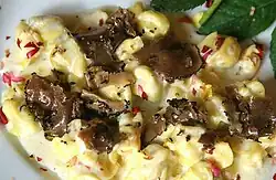 Fagottini (Italian: [faɡotˈtiːni]; lit.'little bundles'; singularly, fagottino) is a filled pasta. It is usually filled with vegetables, typically steamed carrots and green beans, ricotta, onion and olive oil.[1][2][3][4] Fagottini are made by cutting sheets of pasta dough into squares, placing the filling on the square, and folding the corners to meet in a point.[5]