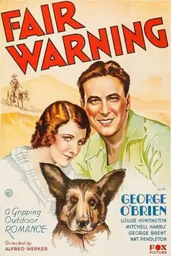 Fair Warning is a 1931 American pre-Code Western film directed by Alfred L. Werker and starring George O'Brien, Louise Huntington and Mitchell Harris. It is a remake of the 1920 silent film The Untamed.[1] The 1937 film Fair Warning is not a remake of this one.[2] The film's premise came from a novel by Max Brand, which initially was published in serial form in The All-Story from December 7, 1918, through January 11, 1919.[3]
