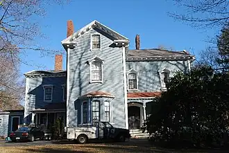 The house stands in a residential area east of downtown Taunton, on the east side of Elm Street opposite its junction with Vine Street. It is a 2+1⁄2-story wood-frame structure, with a cross-gabled roof and clapboarded exterior. It is a roughly T-shaped plan, with a central front-gable section, a section projecting right from its midsection, and another projection to the left near the rear. Its roof has extended eaves with large modillion blocks, and windows are set in segmented-arch openings. The front entrance is sheltered by a porch whose sections have a similar segmented-arch valances, supported by chamfered square posts. Windows on the second floor have elaborate surrounds with a bracketed sill and gabled hood. The frontmost section of the main block has a first-floor polygonal bay, topped by a turret-like roof with modillioned eave.[2]