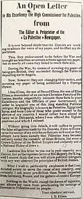 Falastin went "[f]rom publishing only a few articles on Zionism every month in its first year" to "soon publishing an article or more per issue on the subject," and the paper ultimately "came to be relied upon by newspapers throughout the region for news of Zionist colonization in Palestine."[4] The newspaper addressed its readers as Palestinians since its inception in 1911 during the Ottoman period.[2][3]
