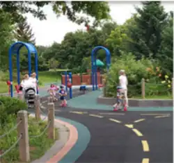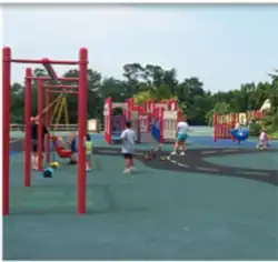 In 1999, Hadley's Park opened with a castle, a frontier village and a pirate ship. Rather than using gravel or woodchips, Hadley's Park had a rubber-based surface covering 34,000 square feet (3,200 m2) of playing surface.[5] This is one of the largest pour-in-place playing surfaces in the world.[5] The surface is durable enough for wheelchairs and walkers, yet soft enough not to hurt a child if they fall. The incorporation of high edge curbs, bright colors and braille signage supports visually-impaired children.[5]