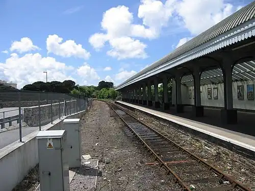 The station was constructed out of granite was 200 feet (61 m) long and 90 feet (27 m) wide, the three tracks and two platforms being covered by a train shed. As no other stations were provided in the town at the time it was known just as 'Falmouth', and was opened on 24 August 1863.[1] A large goods shed and a 100 feet (30 m) long engine shed were both provided just outside the station. A siding ran down to the docks from the end of the platform.[2] A camping coach was positioned here by the Western Region from 1962 to 1964.[3]