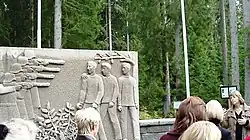 The Falstad Centre's director, Tone Jørstad, guides a group in the woods where prisoners were killed. The relief Arkebusering (Execution by Firing Squad), by Odd Hilt, shows a German firing squad executing three Norwegian patriots.