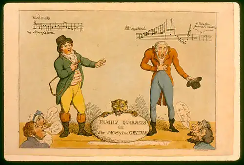 Thomas Rowlandson's cartoon "Family Quarrels" depicting Braham and Incledon does not refer explicitly to the disturbances at Covent Garden, but summarizes the rivalry of these two popular favourites, contrasting Braham's floridity (marked "Allegro squeakando") with Incledon's more stolid approach to singing. In the bottom corners are seen the Jewish fans of the former and the gentile fans of the latter.[13]