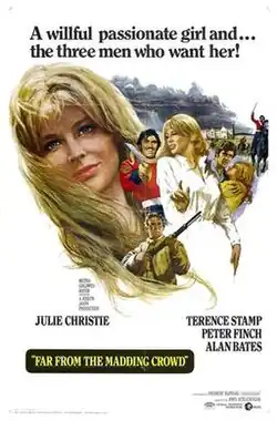Far from the Madding Crowd is a 1967 British epic period drama film directed by John Schlesinger and starring Julie Christie, Alan Bates, Terence Stamp and Peter Finch.[4] The screenplay was by Frederic Raphael adapted from Thomas Hardy's 1874 novel Far from the Madding Crowd. It was Schlesinger's fourth film (and his third collaboration with Christie). It marked a stylistic shift away from his earlier works exploring contemporary urban mores. The cinematography was by Nicolas Roeg and the music was by Richard Rodney Bennett, who also used traditional folk songs in various scenes throughout the film.