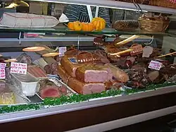 Beef and pork products sold at farmers' market in the US, like those of any other beef/pork product that are sold to the public, must originate from livestock slaughtered in a government (federal or state) inspected slaughterhouse.[31] Since government inspected slaughterhouses purchase livestock for slaughter, many often have the facilities, equipment, and personnel to supply meat products to distributors/wholesalers. Like restaurants, such arrangements are popular with farmers' market vendors because they allow them to avoid the overhead costs (facility, equipment, knowledge, maintenance, food safety inspections, etc.) associated with producing meat products that may be legally sold to the public.[32][33] Resell vendors are in the majority at farmers' markets while vendors that make and package their own meat products represent a very small percentage. Reselling allows vendors to minimize investment and overhead costs by purchasing their products from a commercial slaughterhouse and/or processing plant.[34][35]