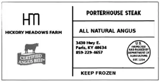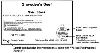 The official inspection legend includes an establishment number (EST) that identifies the last company that did the processing/butchering, packaging, and labeling of the product. Since the label includes the "distributed by/packed for" statement, the meat may come from the livestock of other farmers/ranchers or a corporate feedlot. The presence of a government inspection legend identifies a meat product that was not processed and packed by the selling vendor. Meat products prepared and packed by the selling vendor or butcher will not include a government seal, and will not include any type of statement that classifies the vendor as a reseller/distributor.[37]