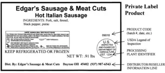 Most processed meat products (sausage, bacon, hot dogs, frankfurters, snack sticks) sold at farmers' markets have labels that include a "distributed by/packed for/etc." statement as well as a government inspection legend. The government inspection legend includes an establishment number (EST #) that identifies the commercial processing plant that made and packaged the products; similar to a package of sausage or bacon sold in supermarkets.[38] Alternately, a processed meat product sold at a farmers' market that does not include a "distributed by/packed for/etc." statement and a government inspection legend is a product that is made and packaged by the selling vendor. There are also vendors that sell processed meat products that include a government inspection legend without a "distributed by/packed for/etc." statement; such vendors are selling co-pack products in which the maker/producer prepares and packages the product according to the vendors' recipe.[39]
