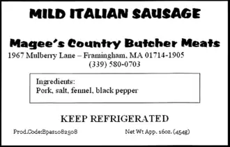 A product label of a farmers' market vendor that makes and packages its own product will not include a "distributed by/packed for/etc." statement, and it will not have a government inspection legend because its products are sold directly to the consumer.[43] Information on the producing vendor's label will include the following information: