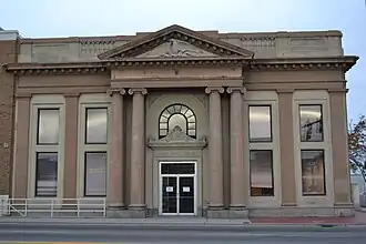 The Farmers and Merchants Bank, now the Nampa Public Library, at 101 11th Ave., S., in Nampa, Idaho is an Idaho bank building whose construction began in 1919. It was designed by Idaho's most notable architects Tourtellotte & Hummel in Classical Revival style that suggests solidity. It is a 60 feet (18 m) by 90 feet (27 m) two-story building with a portico consisting of a pediment supported by two pairs of Ionic columns. The pediment's tympanum contains an eagle sculpture. Within the portico, above the front door of the bank, is "Nampa Public Library" in block letters and a smaller pediment is sculpted and includes insignia of the First National Bank.[2]