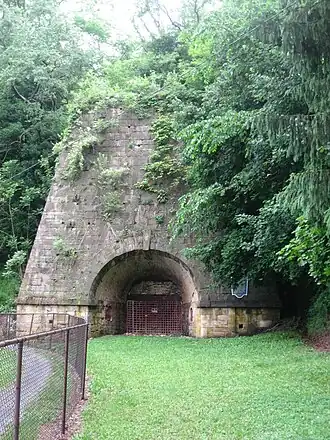 Capitalists from Boston financed the furnace's construction starting in 1836. John Thomas likely supervised construction and John P. Salmon was the master mason. It was equipped with Scottish machinery installed by Scot James Ralston, and produced fifty tons of pig iron per week.[2][3] Bituminous coal was mined at nearby Minersville and transported by inclined plane. Transportation of iron ore was from over 100 miles away via canal, but this proved difficult, as did transportation of flux from the Nittany Valley.