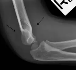 The fat pad sign, also known as the sail sign, is a potential finding on elbow radiography which suggests a fracture of one or more bones at the elbow. It may indicate an occult fracture that is not directly visible. Its name derives from the fact that it has the shape of a spinnaker (sail).[1] It is caused by displacement of the fat pad around the elbow joint. Both anterior and posterior fat pad signs exist, and both can be found on the same X-ray.