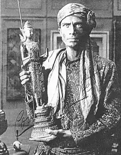 A shot of Conrad Veidt as the Indian priest holding the sacred statue