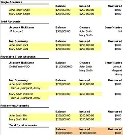 Each ownership category of a depositor's money is insured separately up to the insurance limit, and separately at each bank. Thus a depositor with $250,000 in each of three ownership categories at each of two banks would have six different insurance limits of $250,000, for total insurance coverage of $1,500,000.[18] The distinct ownership categories are:[18]