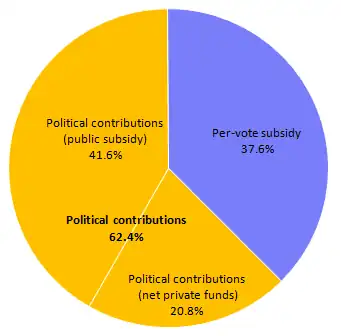 The electoral expense reimbursement, which accounts for the largest part of the public financing following an election ($54 million in 2009), reimburses 50%-60% of a party's expenses on elections - the more a party spends during an election, the more public funds they get back.[1][3]