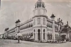 Hubback's Indo-Saracenic design was similar to other buildings which he had previously designed in Kuala Lumpur such as the nearby former Municipal Office and Town Hall and Jamek Mosque. Its facade features a 400 foot long colonnade on both floors with distinctive 'cinquefoil' (five-leafed clover) arches, terminated at each end by two 80 foot high octagonal towers surmounted by onion shaped domes of copper.[6]