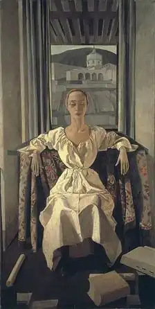 In 1918, "intrigued by the decadent atmosphere of Turin with its sinister views", he settled there with his mother and two sisters.[3] His works of the next decade typify, in their emphasis on geometry and formal clarity, the "return to order" then prevalent in the arts as a reaction to the war. Although many critics found his work cold, cerebral, and academic, Casorati achieved international recognition as a leading figure in this movement.[4] Often working in tempera, Casorati drew inspiration from his study of Renaissance masters, especially Piero della Francesca, as in his 1922 portrait entitled Silvana Cenni.[5] This symmetrical composition of a seated woman in a white dress is perhaps the best-known of the artist's works.[5] In it, the careful rendering of volumes results paradoxically in a sense of unreality which is characteristic of Casorati's art.