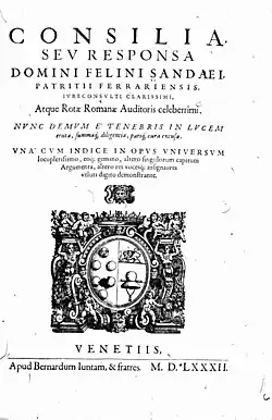 - Sandeo, Felino Maria (1582). Consilia (in Latin). Venezia: Bernardo Giunta & fratelli.