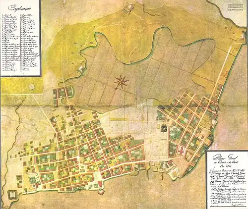 Other Indian revolts occurred until July 1621, when in 1639 Bento Maciel Parente, sergeant major of the Cabo Norte Captaincy, invested in the village of the Tapajó Indians, decimating them and dominating the Conquista do Pará.[5][4] With the victory he was appointed Donatary captain of Grão-Pará, the Conquista was transformed into the then Captaincy of Grão-Pará (along with the creation of the State of Maranhão, with headquarters in São Luís),[10] and the settlement was elevated to the category of municipality with the name "Santa Maria de Belém do Pará" or "Nossa Senhora de Belém do Grão Pará" (later "Santa Maria de Belém do Grão Pará"),[13][4][2][2] when the first streets of the region were built, originating the historic district of Cidade Velha.[5]