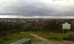 The Fenton skyline, mostly a residential area, with a prominent church (Christ Church) being a notable feature. As taken on a cloudy day in August, 2010, atop Glebedale Park Hill. This latter was immortalized in music in 2010, in a work for full symphony orchestra, written by local violinist, pianist, and composer, Vic Carnall, and entitled, "Glebedale Park Hill", which, with an orchestra of 100 players, received its première performance at The Victoria Hall, Hanley, Stoke-on-Trent, on 6 November 2010, as part of the centenary celebrations of Stoke-on-Trent's Federation in 1910.