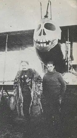 ![]() Belgian Capt Fernand Jacquet and mechanic with Belgian Farman HF.20 pusher (with skull insignia) of the 2me Escadrille de Chasse, Day Reconnaissance. | |