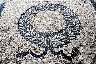 These are the largest baths discovered in the town, excavated in the 1970s. They were built over a housing block (insula) next to the forum. Floors were paved with monochrome mosaics, one with a laurel wreath motif in the centre. In the 5th century a church was built in the atrium. They had a separate, smaller women's section with only a frigidarium and a calidarium. Brick stamps show that repairs were done under Emperor Caracalla (r. 198-217) and some partly coloured mosaic panels were possibly added then.