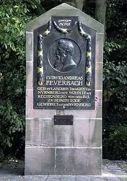 In 1860, his wife's porcelain factory went bankrupt, and at the age of fifty-six, Feuerbach found himself again without a source of income. He moved to Rechenberg, near Nuremberg, where he lived until his death.[12] His final major work was "Spiritualism and Materialism" (1866). In 1868, he read Marx's Capital with enthusiasm, and in 1870, he joined the German Social Democratic Party.[14] Two years later, on 13 September 1872, Feuerbach died and was buried at the Johannisfriedhof in Nuremberg.[14]