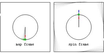 Figure 5: Crossing a rotating carousel walking at a constant speed from the centre of the carousel to its edge, a spiral is traced out in the inertial frame, while a simple straight radial path is seen in the frame of the carousel.