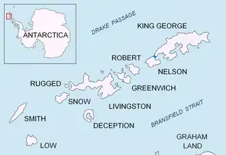 Fildes Strait is a strait which extends in a general east-west direction between King George Island and Nelson Island, in the South Shetland Islands. This strait has been known to sealers in the area since about 1822, but at that time it appeared on the charts as "Field's Strait". It was probably named for Robert Fildes, a British sealer of that period,[1] whose vessel Robert was wrecked in Clothier Harbour in 1822.