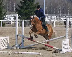 The riding horse section Finnhorse is a capable and reliable mount. It lacks some traits required for competing at the highest levels of international riding sports,[61] but its combination of size and good temperament makes it suitable for both adults and children.[8][62] To qualify for the riding section, a horse must carry itself well, and have a long neck, small head, sloping shoulder and well-defined withers. The body must not be too long.[39] The universal Finnhorse breeding goals have made the breed of a lighter build, with longer neck, better gaits and fewer faults in conformation, allowing modern riding-type Finnhorses to work more easily on the bit. Even the temperament of the riding section animals appears to have become more lively.[63] To pass the studbook evaluation, a riding type horse must either have placed in a Grade IV dressage or combined driving competition, or pass a dressage test; must pass a jumping evaluation and a ridability test, and possess clean gaits. Mares may be qualified solely on grounds of a ridability test and a movement evaluation.[40]