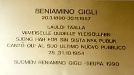 Finnish Beniamino Gigli Club (Finnish: "Suomen Beniamino Gigli - seura") is a Finnish society, founded in 1985 to promote the life work of the tenore Beniamino Gigli. It engages in cultural exchange between Finland and Italy by organizing opportunities for Finnish singers to sing in Recanati and, correspondingly, opportunities for Italian singers to sing at Beniamino Gigli memorial concerts in Finland.