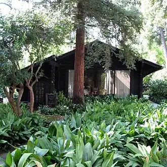 The Swiss chalet-like structure, constructed of redwood with a stone roof, was built in 1910 as a garage for Arthur Fleming's Wigmore Estate. Fleming's architect, Frederick Roehrig, also designed portions of the Green Hotel in Pasadena. In 1949 Paloheimo learned that the unusual structure was for sale, and moved it onto the grounds of the Fenyes Estate to serve as a folk art museum, guest house, and sauna. Paloheimo filled the building with farmhouse furnishings he collected from several provinces in Finland, and did much of the stone work and gardening himself.[5] The museum have large areas of lawn, with the beautiful Fenyes Mansion as a background, are ideal for wandering.[6]