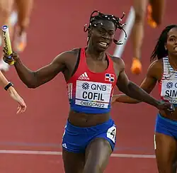 Fiordaliza Cofil (born 27 October 2000)[1] is an athlete from the Dominican Republic of a Haitian background who competes as a sprinter. She won the gold medal in the mixed 4 × 400 metres relay at the 2022 World Athletics Championships. Cofil holds Dominican Republic records in the 100 metres, as well as the women's and mixed 4 × 400 m relay.