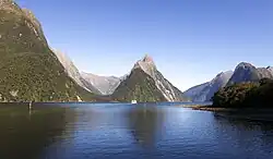 Milford Sound / Piopiotahi, the most famous tourist destination in Fiordland, and the only fiord accessible by road[22]