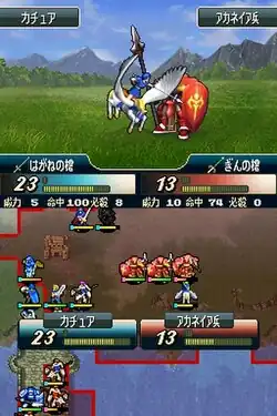 Battles take place on a grid-based map, with the battle system employing a turn-based system for the player, enemy units and allied units. The movement and attack ranges of enemies can be optionally displayed to players. While seventy-four units are accessible in-game by completing its chapters, only twelve can be taken into battle at any one time.[4][6] When two units engage, a separate battle screen activates, and the battle plays out automatically. Enemy resistances to weapons are covered by the Weapon Triangle: lances are strong against swords, swords are strong against axes, and axes are strong against lances. Each unit gains experience points with each action, and when they accumulate 100 points, they level up and their stats are randomly raised. Each unit has a class, which affects their weaponry and movement range: these classes, when at level 10, can be promoted to a stronger class using a Master Seal item.[6]
