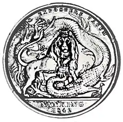 The First China War Medal's reverse was originally designed depicting the British lion trampling on the fallen Chinese dragon. However, this was considered too insensitive to the Chinese and so the reverse described above was used, although a number of specimens of the first type were made.[1]