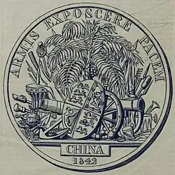 Reverse: a shield bearing the Royal coat of arms with a palm tree and trophy of arms behind, with the inscription "ARMIS EXPOSCERE PACIM" above and "CHINA 1842" in the exergue below.[2]