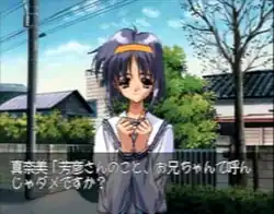Average gameplay, showing a conversation where Manami asks the player character if she can call him onii-chan (big brother).