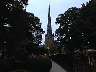First Presbyterian Church is a historic Presbyterian church located at 200 W. Trade Street in Charlotte, Mecklenburg County, North Carolina. It was built in 1857, and is a one-story, Gothic Revival style stuccoed brick building. The original spire was rebuilt in 1883-1884 and the side and rear walls of the church were taken down and a new structure was erected in 1894–1895.[2]