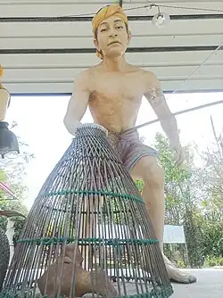 A figure of an ancient Meitei fisherman trying to catch fish using a traditional Meitei wooden (bamboo) basket like cage (known as "long-oop" or "long-up") in Menjor Multipurpose Research Centre and Unity Park