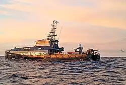 The official body responsible for the sustainable development of fisheries in the Falklands is the Department of Natural Resources, Falkland Islands Fisheries Department (FIFD), established in 1987.[1] It is reported that during 2013 the Loligo fishery had the best results.[2] The waters around the Falkland Islands, known as the Falklands Inner Conservation Zone (FICZ) and Falklands Outer Conservation Zone (FOCZ) are Policed by the Fisheries Protection Vessel Lilibet. FPV Lilibet is a civilian crewed Damen Stan 5009 patrol ship with a maximum speed of up to 29.5 knots (54.6 km/h; 33.9 mph) and a crew of up to 28 persons. She has an endurance of 30 days. If patrolling at 10 knots she can reportedly operate for 30 days with a range of up to 7,000 nautical miles. She is fitted with two Browning .50 calibre heavy machine gun mounts though she routinely deploys unarmed.