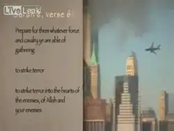 Al-Anfal 60 is shown next to a video of the attacks of September 11.