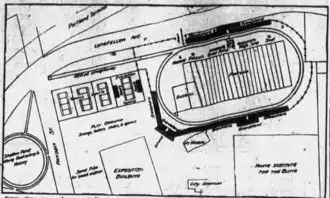 Plans have existed for a stadium for Portland's high schools since at least 1921. At this time, the Portland School District pushed to have a publicly funded stadium to replace its use of Bayside Park, which Portland and Deering High School shared.[3] In 1923, the Portland Evening Express published plans for a football and baseball stadium next to the Portland Exposition Building.[4] That March, the state senate passed a bill approving the stadium.[5] Architect Gavin Hadden designed a proposal for the stadium between Ocean Avenue and Back Bay Boulevard. The proposal would be phased out: the first stage would build the two sideline stands, costing $170,000 and seating 11,000, and the final design would cost $440,000 and seat 33,000 when completed.[6]