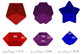 The minimum energy or thermodynamic shape for these particles[7][8] depends upon the relative surface energies of different facets, similar to a single crystal Wulff shape; they are formed by combining segments of a conventional Wulff construction with two additional internal facets to represent the twin boundaries.[8][7] An overview of codes to calculate these shapes was published in 2021 by Christina Boukouvala et al.[74] Considering just {111} and {100} facets:[7][8]