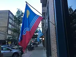A flag of Sioux Falls in Downtown Sioux Falls, with a flag of South Dakota in the background