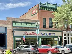 A flag of Sioux Falls in front of Zandbroz Variety in Downtown Sioux Falls